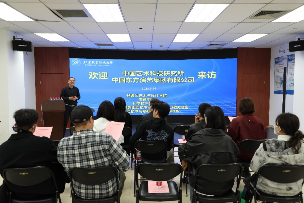 2023年3月29日下午,中国艺术科技研究所副所长庹祖海、科研规划处处长张晓华、数字艺术部刘浩洋、解超云,中国东方演艺集团有限公司副总经理张蕾、北京东方新大陆文化艺术有限公司副总经理邹一鸣、吴杉,项目部经理王雯雯、李喆等一行到访北航beats365亚洲体育投注、美育中心、虚拟现实技术与系统全国重点实验室交流并进行深入座谈。北航科学技术研究院、计算机学院、beats365亚洲体育投注、美育中心负责人等参加座谈。