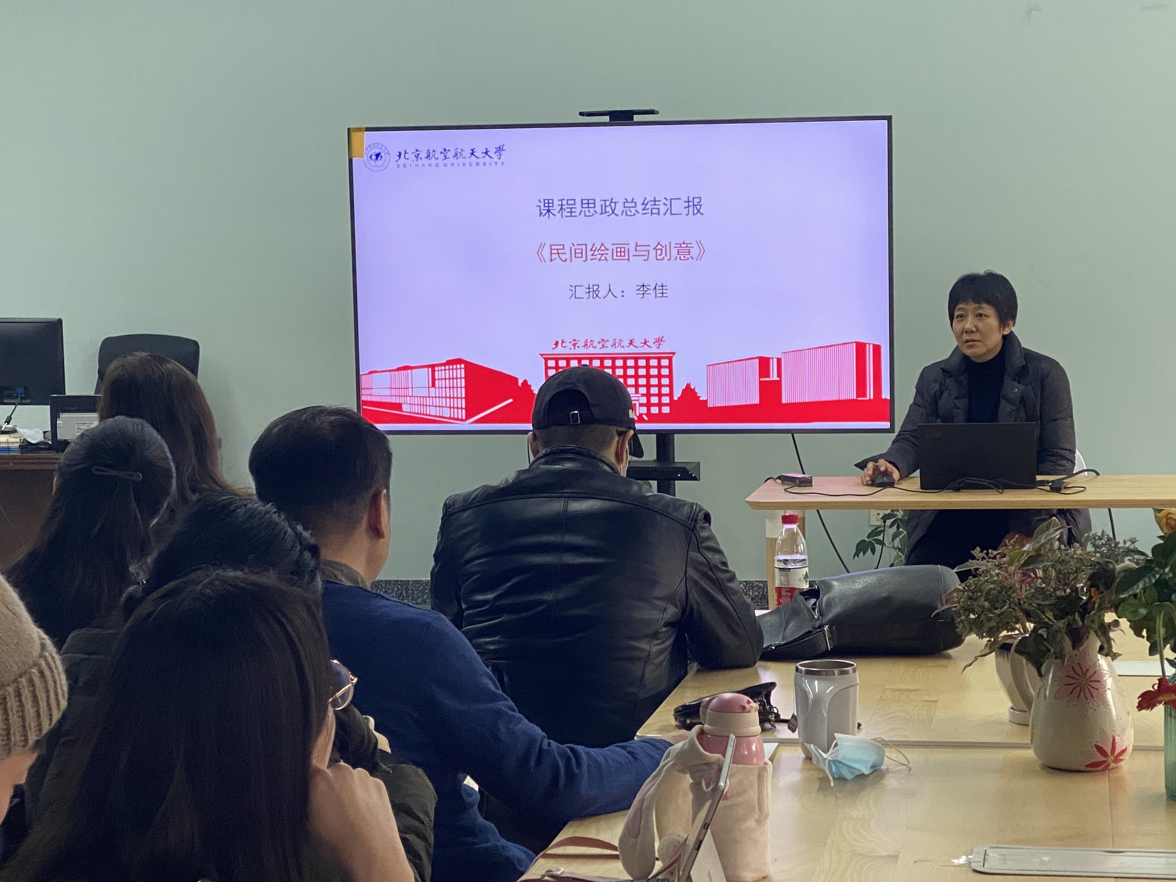 128日下午,学院在新主楼B332组织全体教职工“学习日”活动,李佳老师在会上就北航课程思政示范课程《民间绘画与创意》进行了分享交流,学习内容主要包括:课程基本情况、课程团队情况、课程教学情况,总体设计情况、教学实践情况、课程建设成效、特色与创新等方面。结合北航创新型、综合型、实用型艺术人才培养的目标定位,根据北航艺术专业的特色和优势,深入研究和提高艺术审美素质为目标。在教学中引导学生立足时代、扎根人民、深入生活,树立正确的艺术观和创作观。坚持以美育人、以美化人,积极弘扬中华美育精神,自觉传承和弘扬中华优秀传统文化,全面提高学生审美和人文素养,增强文化自信。