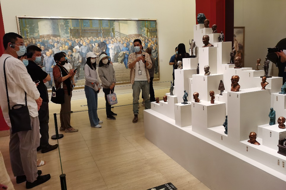 展览部的韩金峰老师讲解吴为山馆长作品《高山仰止》
