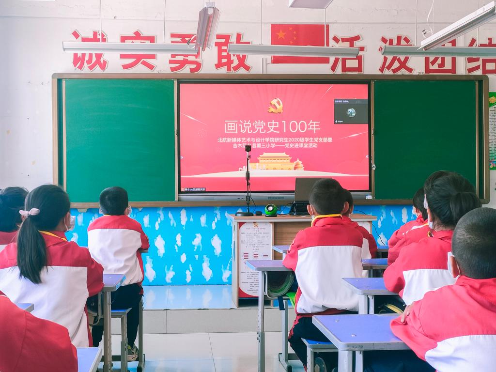 制作完成的立体书通过邮寄的方式寄到小朋友的手中,2021年4月21日下午,北航beats365亚洲体育投注研究生2020级学生党支部与新疆维吾尔自治区昌吉回族自治州吉木萨尔县第三小学的老师和五(7)班的同学们,通过线上视频会议的形式,开展了一场活泼生动的《画说党史100年》进课堂活动。在党史进课堂活动的现场,参与设计的党员用生动的语言向小朋友们讲解立体书每部分背后的故事并展示设计创意,让小朋友们在趣味阅读与动手实践的过程中增强了党史知识学习和理解。