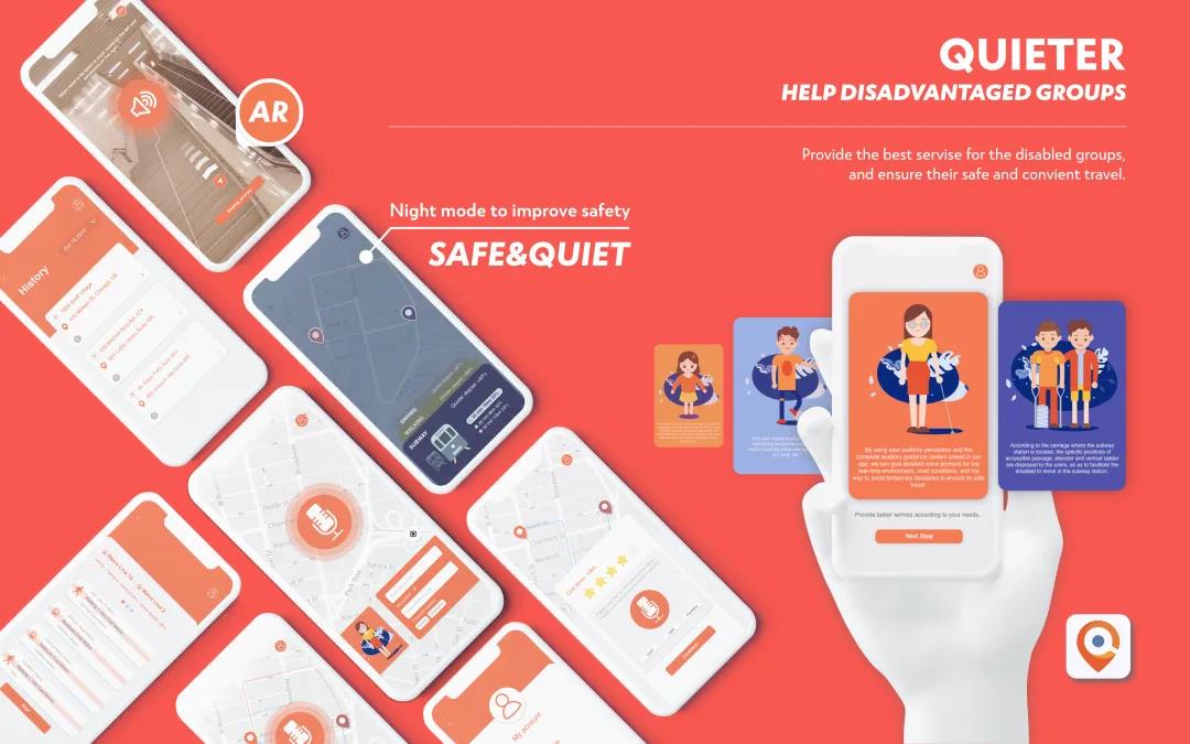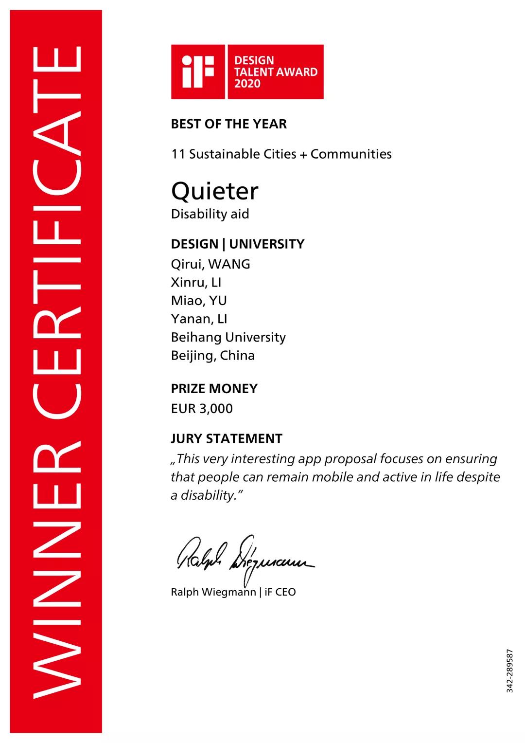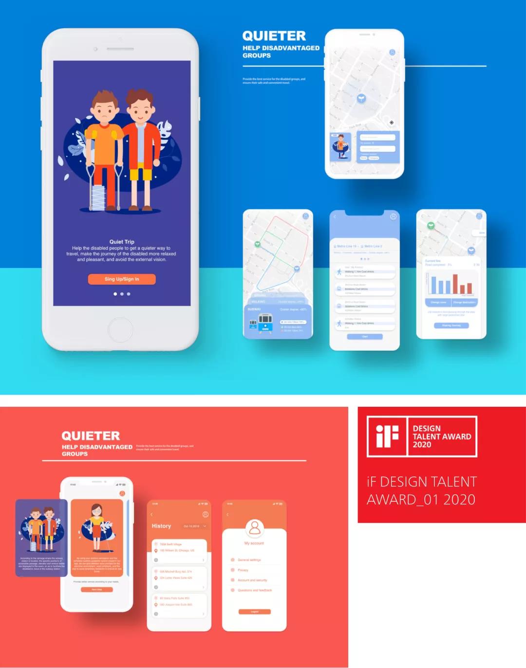 设计作品“Quieter”为其中的“可持续城市和社区(Sustainable cities and communities)”主题进行设计。该项目的目标是“到2030年,因公共交通系统的不断扩大,旨在为所有人(特别是弱势群体、妇女、儿童、残疾人和老年人)提供安全的、可支付的和可持续的交通系统方案,并改善道路安全。”该主题希望探讨设计在解决城市交通的可持续性和提高人类福祉中的相关价值。在全球超过一万件的设计参赛作品中,最终仅有7件作品荣获iF年度最佳奖(BEST OF THE YEAR)。我校beats365亚洲体育投注的本科生王麒瑞、栗歆茹、于淼、李亚男小组在众多参赛者中突出重围,斩获了年度最佳奖(BEST OF THE YEAR)并获得丰厚奖金。iF设计大赛(iF DESIGN AWARD)的评审团在其获奖评语中这样写道:“这个有趣的移动应用设计项目保证了残疾人在生活中的可移动的(mobile)能力和保持活动的(active)能力。”