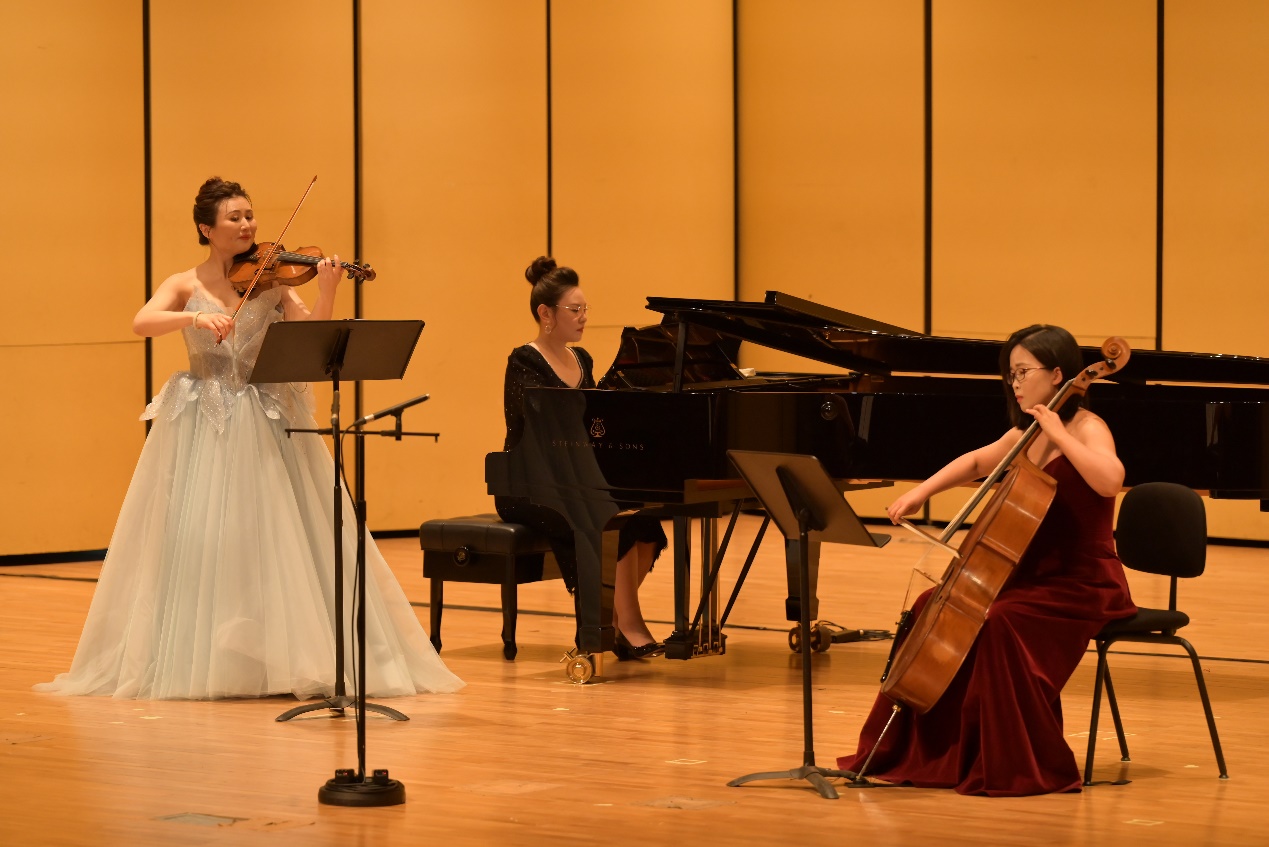 节目最后,两位老师合奏了《F大调小提琴奏鸣曲“春天”》第一乐章、《探戈的历史:1960》,并与特邀嘉宾中国广播艺术团大提琴二级演奏员郑昕宇一起演奏《电影之声》,给本场音乐会画上完美的句号。