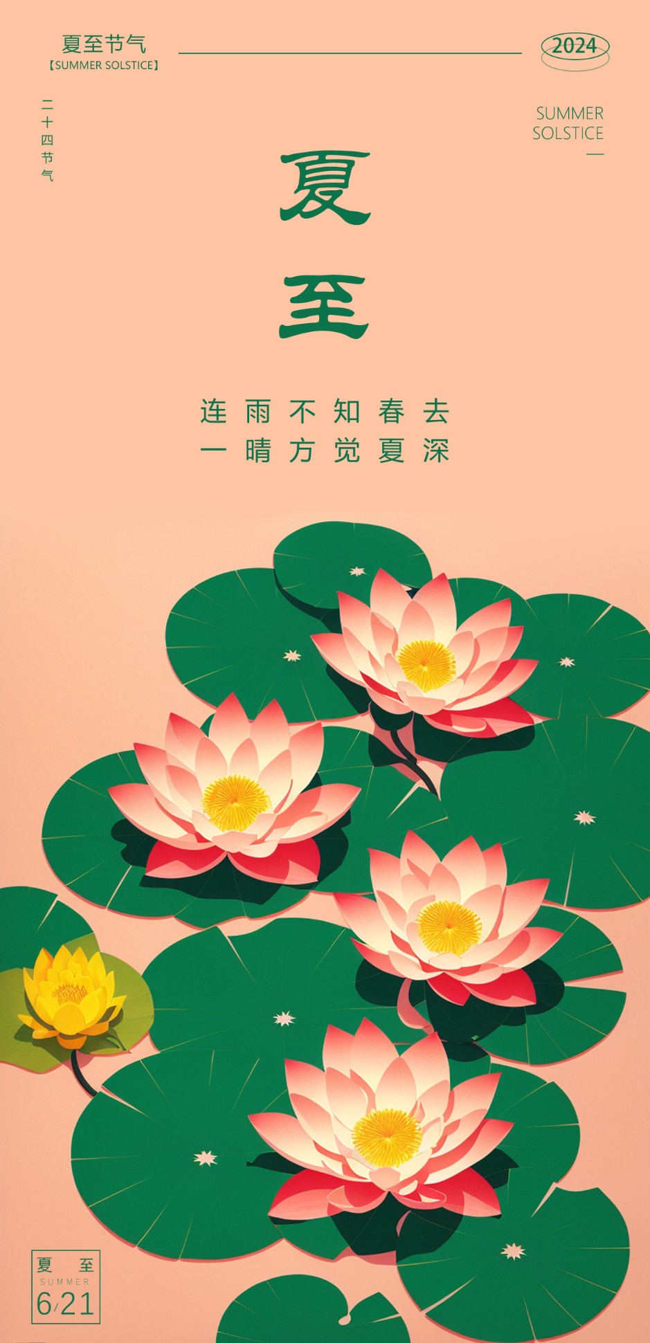 说到夏日,当然避不开西瓜、荷叶等代表性意象,创作者通过简洁明快的设计语言,传达出夏至这一节气的核心特征。作品《采莲曲》以荷叶、莲花元素为主,让中国传统美学风格与现代设计元素碰撞;采用粉色与绿色,画面明亮、对比突出,同时又和谐统一,给人以夏天的感受。