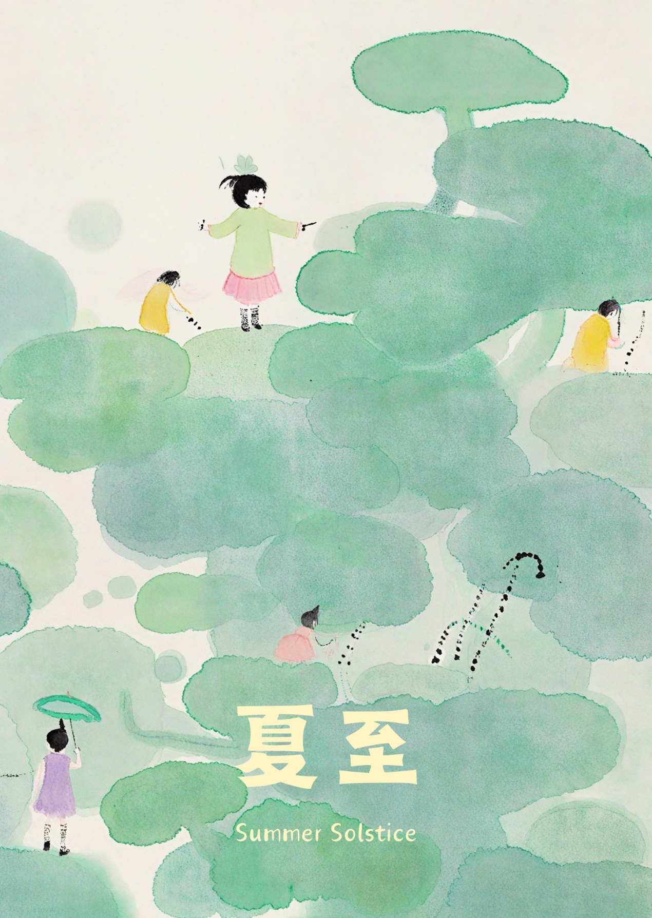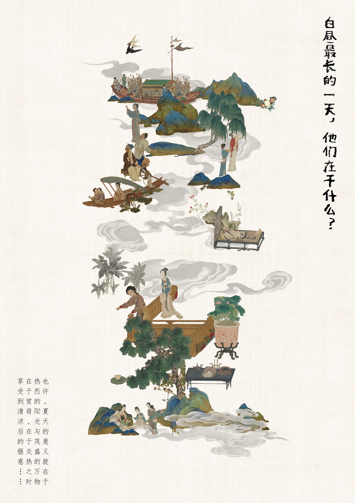而《历代夏至记》则从中国历代名画中提取青翠山川、飞瀑流泉、荷塘莲花等元素,将古人描绘的夏日景色和度夏方式巧妙地融合于“夏至”二字之中。古人纳凉避暑的场景,如凉亭下的文人雅集、荷叶间的轻舟嬉戏等,都在设计中得到了体现。传统国画的云雾技法被用来增强画面的深度和神秘感,同时也模糊了时间的界限,让人仿佛穿越回那个古人纳凉避暑的时代。通过传统国画笔触和夏日色彩的搭配,不仅重现了古人的夏日生活,也让观者感受到二十四节气中夏至的丰富内涵和历史的厚重感。