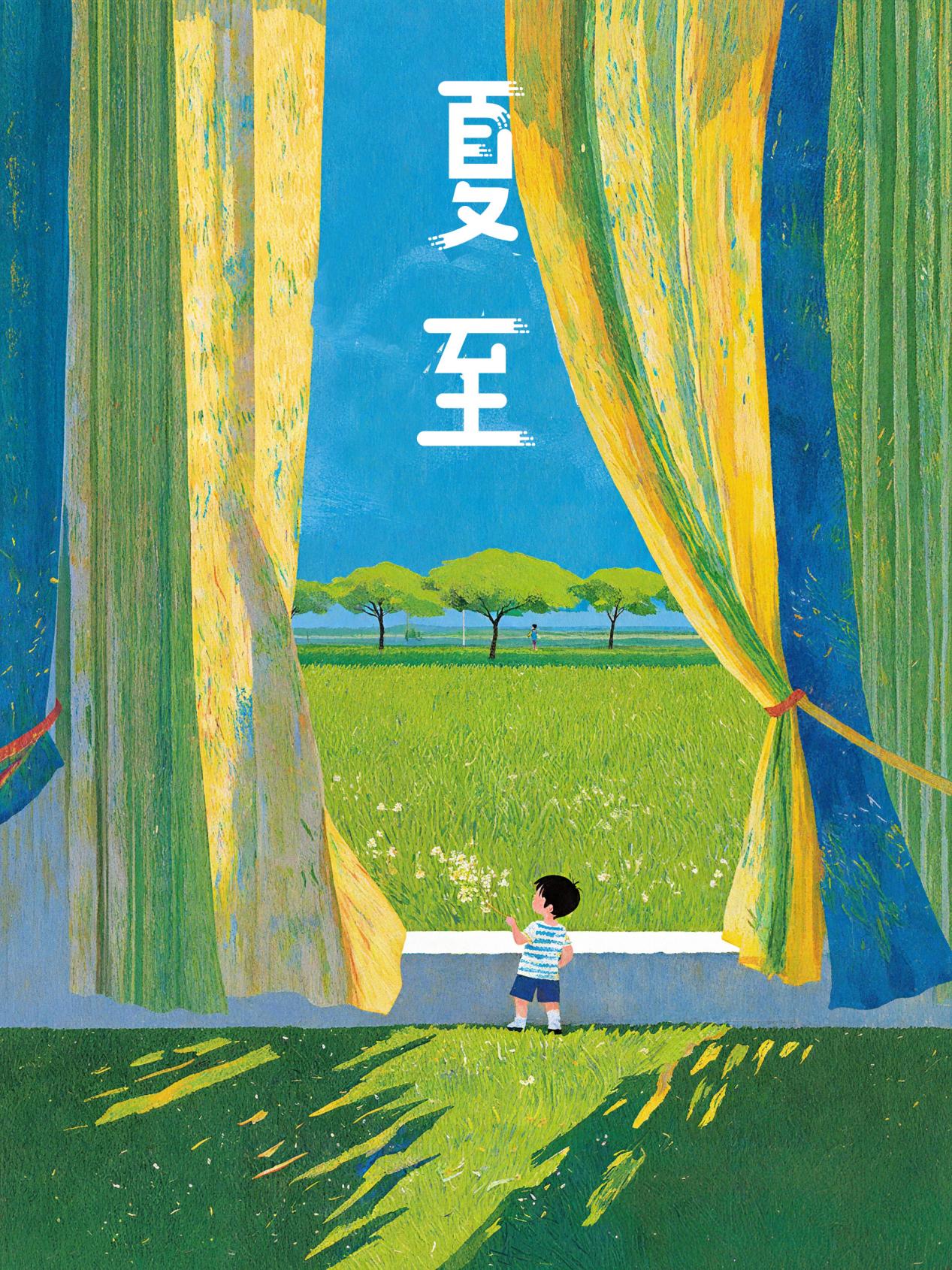 也有的创作者选择从古诗古画中汲取灵感。作品《夏至过东市二绝》引用宋代洪咨夔诗句,展现农家的夏至风光。在设计风格上,以仿古宣纸为底,用浓淡不一的墨色与颜彩,勾勒出诗中质朴的田园意境;通过色块和点线的结合,配以书法字体,以诗入画,阐释节气与中国古代农耕文明千丝万缕的联系。