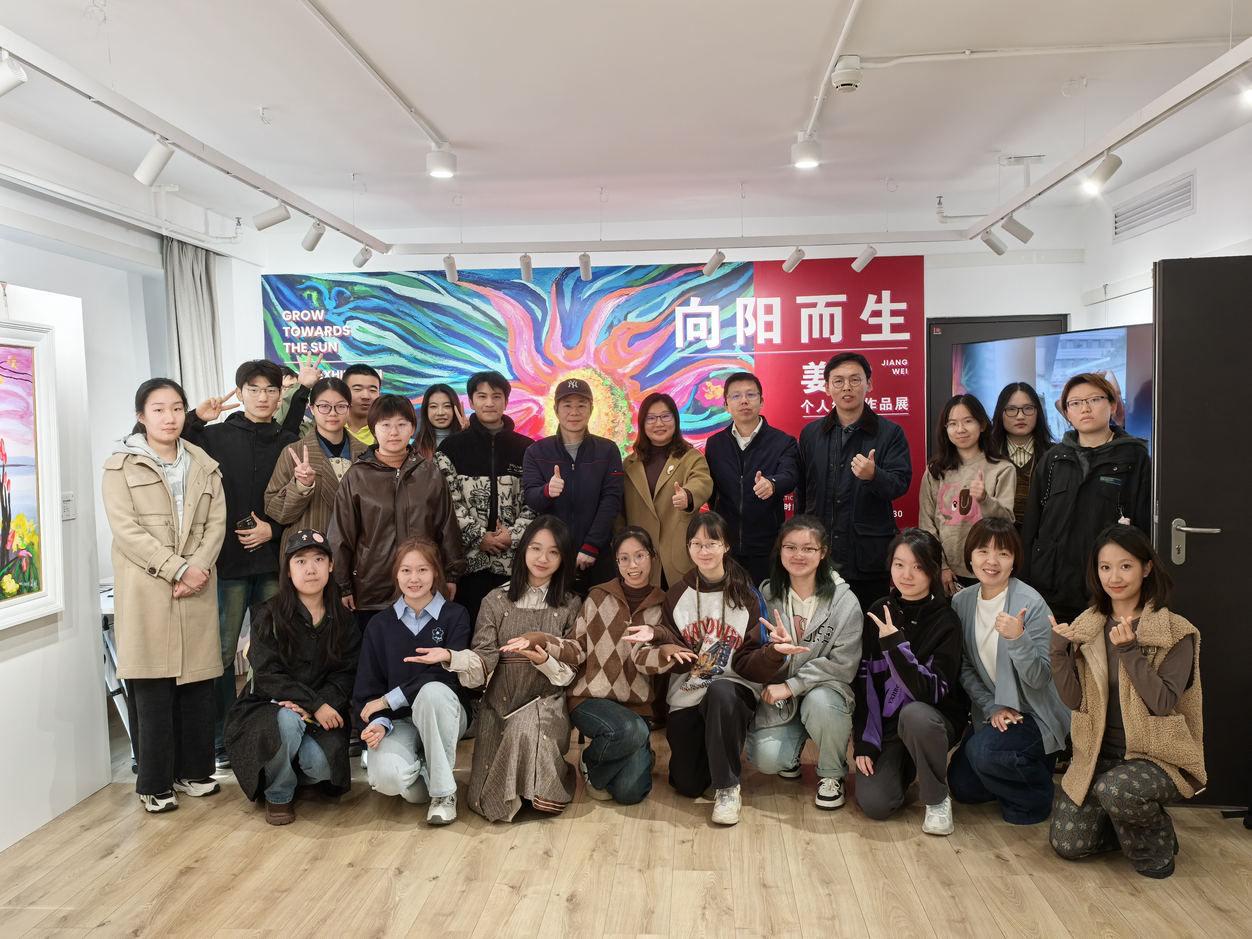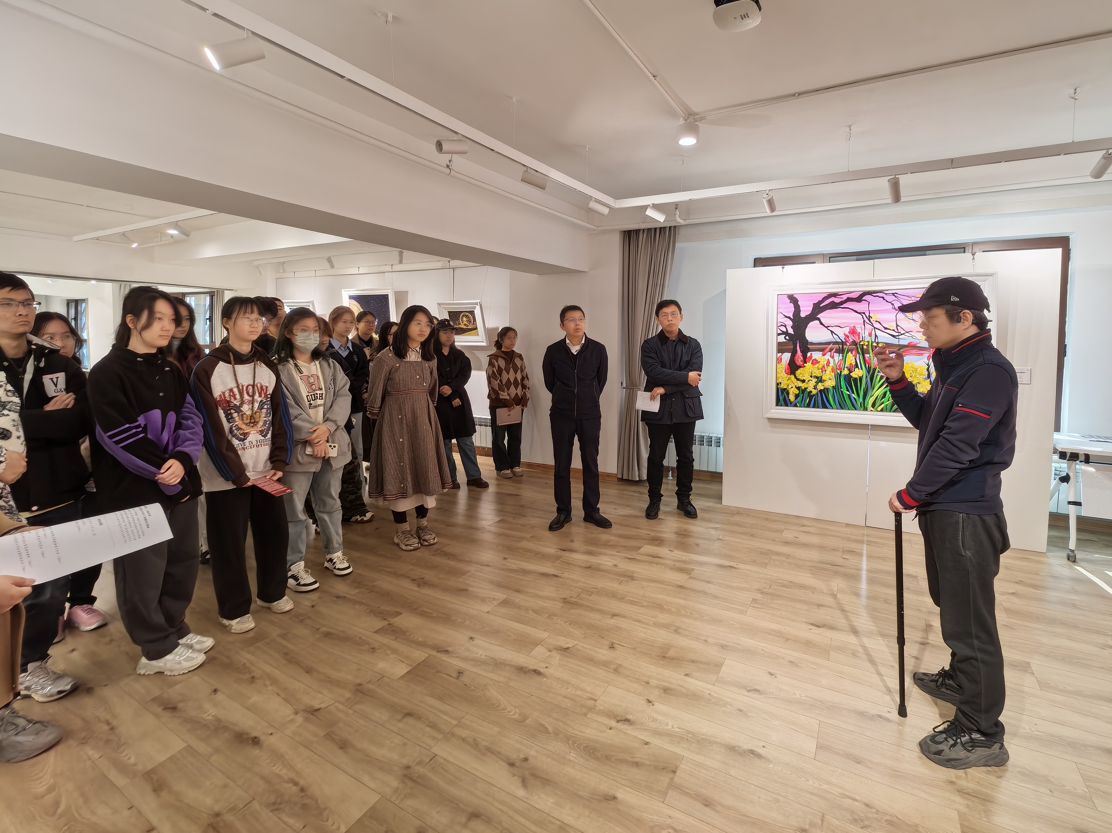 在分享会开始前,绘画系副教授赖盛带领大家参观了正在展出的北航beats365亚洲体育投注2007届毕业生姜维的“向阳而生:姜维个人绘画作品展”。赖盛向同学们讲述了姜维自毕业以来的人生旅程与艺术成就,解读姜维探索艺术的艰难旅程——面对生活的重压与疾病的挑战,他始终没有放弃绘画,反而更加坚定地沉浸在艺术创作中,用画笔表达出对生活的热爱和对艺术的执着追求、将情感融入每一幅作品之中。他的画作中流露出强大的生命力,无论是风景、人物还是动物,都仿佛拥有了灵魂和生命的能量,深深地打动了每一个观者的心。学院和老师们也一直给予姜维无私的关怀与支持,在作品推广上提供极大的帮助,如今,姜维和他的作品受到了社会各界人士的广泛关注,一颗中国艺术的新星正在冉冉升起。