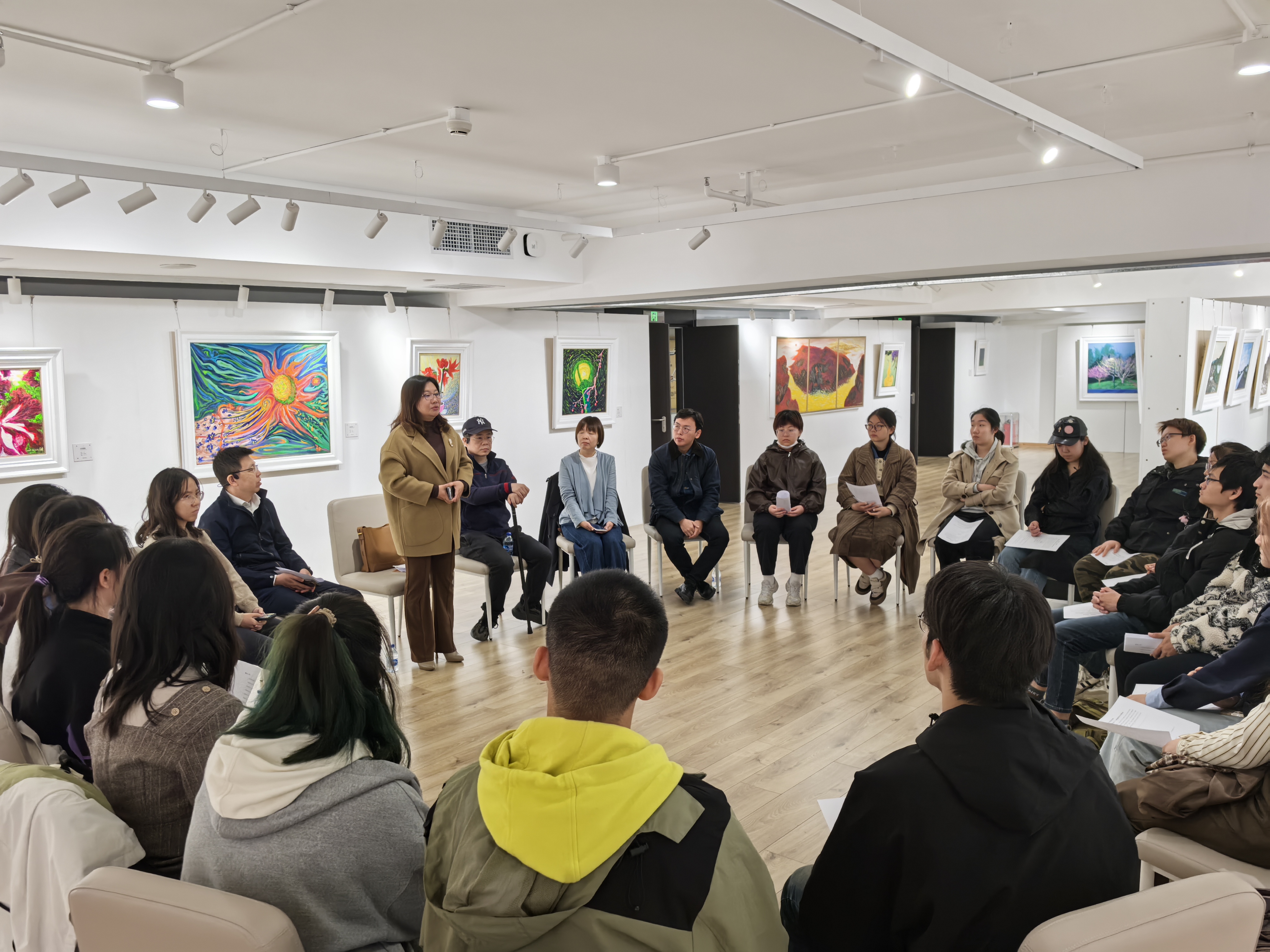 在欣赏完姜维的画作后,老师和同学们在展厅围坐交流分享自己读《中国艺术》的心得感受。左政轩同学从全新的视角分析中国当代的艺术变迁,指出艺术与社会的关系:艺术家与社会背景紧密相连,创作应立足于民族文化的土壤,反映人民大众真实的生活和情感,他的分享让同学们深刻认识到艺术家在社会历史进程中的责任和使命。黄湉淑同学结合《长城颂》等例子,强调了艺术与国家历史、民族精神的紧密联系。她总结道:作为北航新媒体艺术系学生,我们应当在艺术与科技融合的道路上,讲好中国故事,传承中华文脉,为民族艺术的发展贡献自己的力量。班主任崔久霄针对书中内容,并结合姜维个人画展,与同学们进行交流与探讨。他鼓励大家在今后的学习生活中更多的了解中国艺术发展,并将今天的感悟转化为动力,保持对艺术的热爱与不断求索的精神。