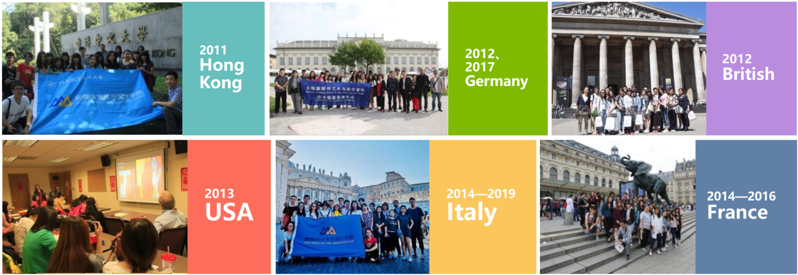 2011年起,学院开展以参观海外艺术博物馆、赴相关高校学习考察为主要的内容暑期游学项目,先后赴香港、德国、美国、英国、法国、意大利等国家开展暑期访问与艺术实践,在拓宽学生视野、促进人才培养方面发挥了极大作用。